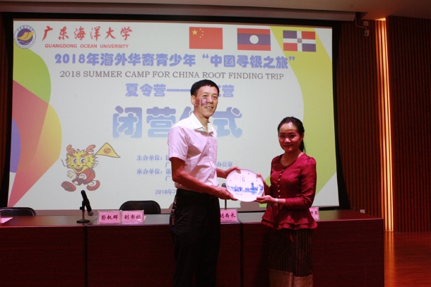 闭营仪式上,湛江市外事侨务局李代明副局长给营员们赠送礼物