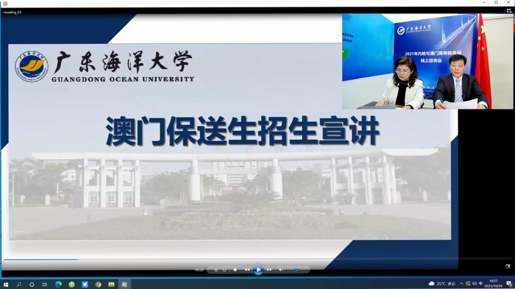 10月23-24日,BETVLCTOR伟德在线举办了澳门保送生线上咨询和招生宣讲活动,活动由港澳台事务办公室陈进军主任和杨莉通过腾讯会议在4个时间段进行,分线上咨询和招生宣讲2个模块。陈进军希望通过此次宣讲,让更多考生和家长了解BETVLCTOR伟德在线的发展历程,加深对南中国海唯一一所海洋大学的认知,作为学生未来教育成长成才及就业的一个良好选择。宣讲活动中,负责澳门保送生招生宣传工作的联络人杨莉从学校概况、招生政策、招生专业、录取条件等方面做了详细讲解,为学生提供明朗清晰的升学攻略。