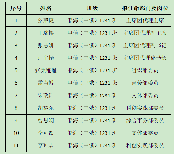 根据《关于同意国际教育学院(圣彼得堡船舶与海洋技术学院合署)团总支(学生会合署)(筹备组)负责人及部门设置的批复》团委20247号及相关文件精神,经学生自荐学院评议小组面试评议,结合申请人入学以来的综合表现情况,初步确定蔡荣捷11同学为团总支(筹)第一届成员。为充分发扬民主,广泛听取意见,接受师生监督,现将拟聘用名单情况公示如下: